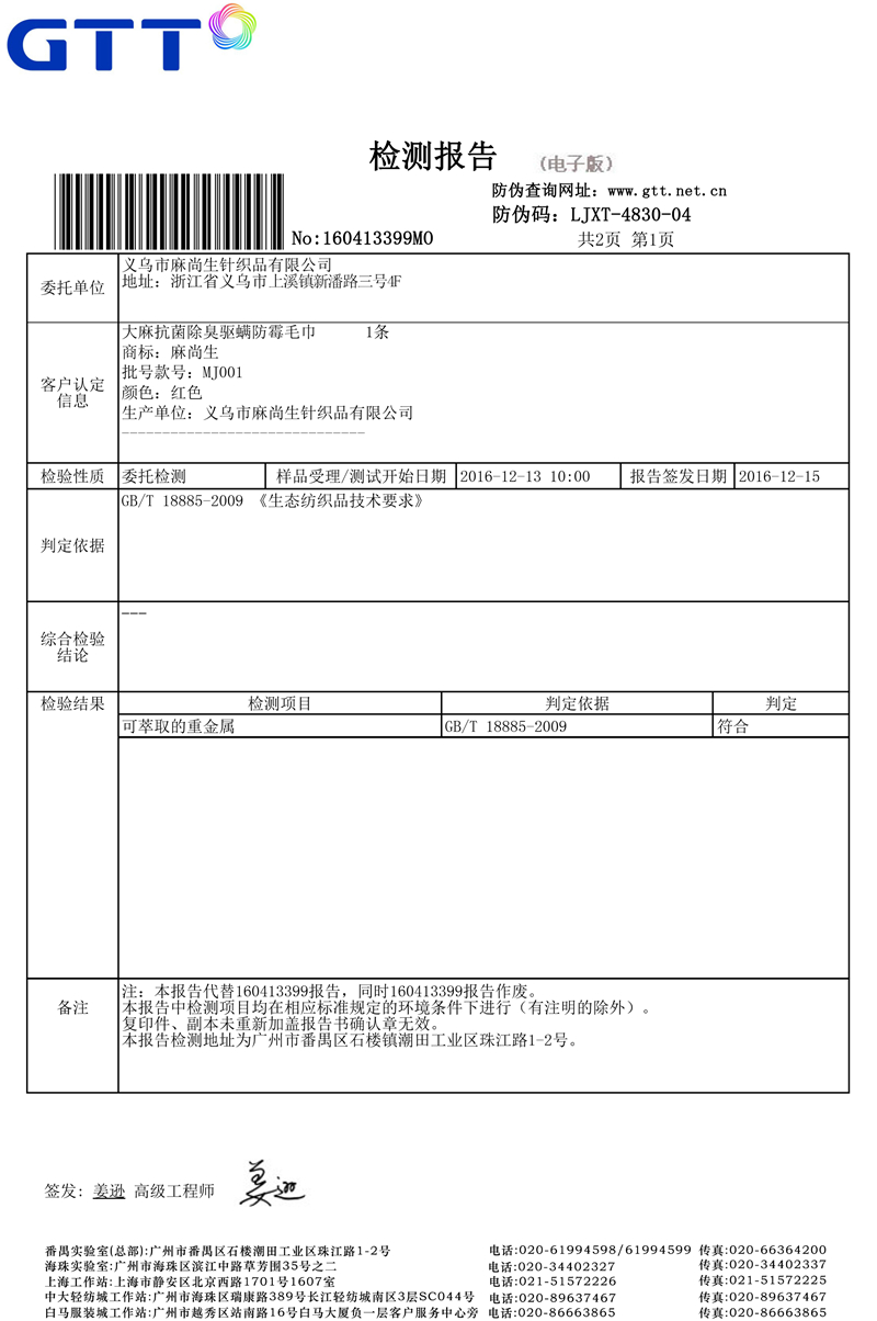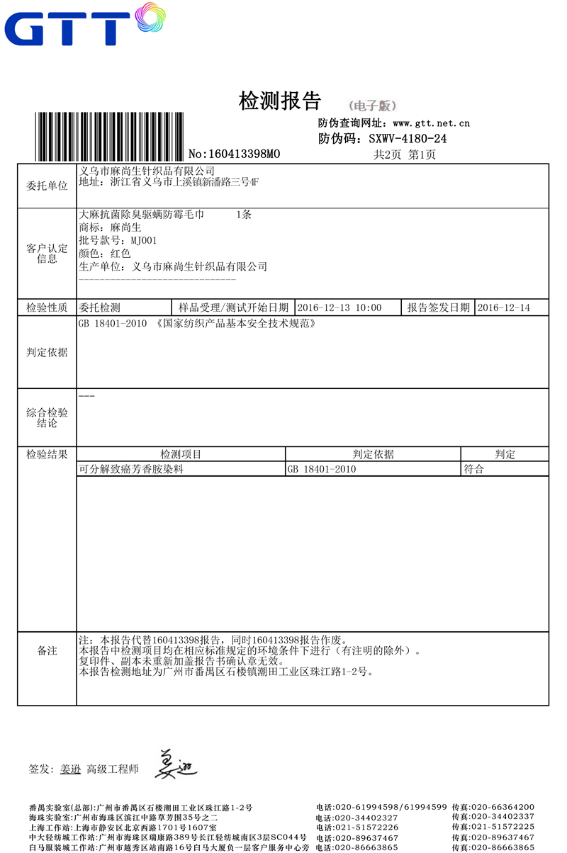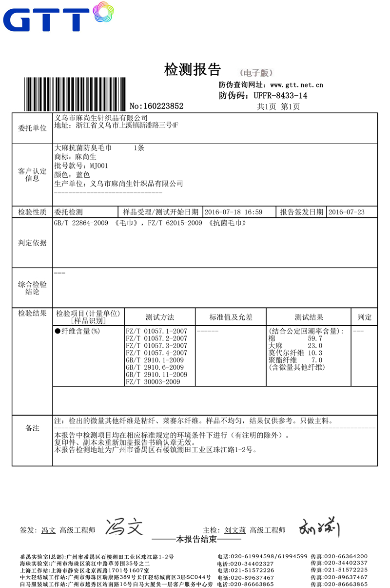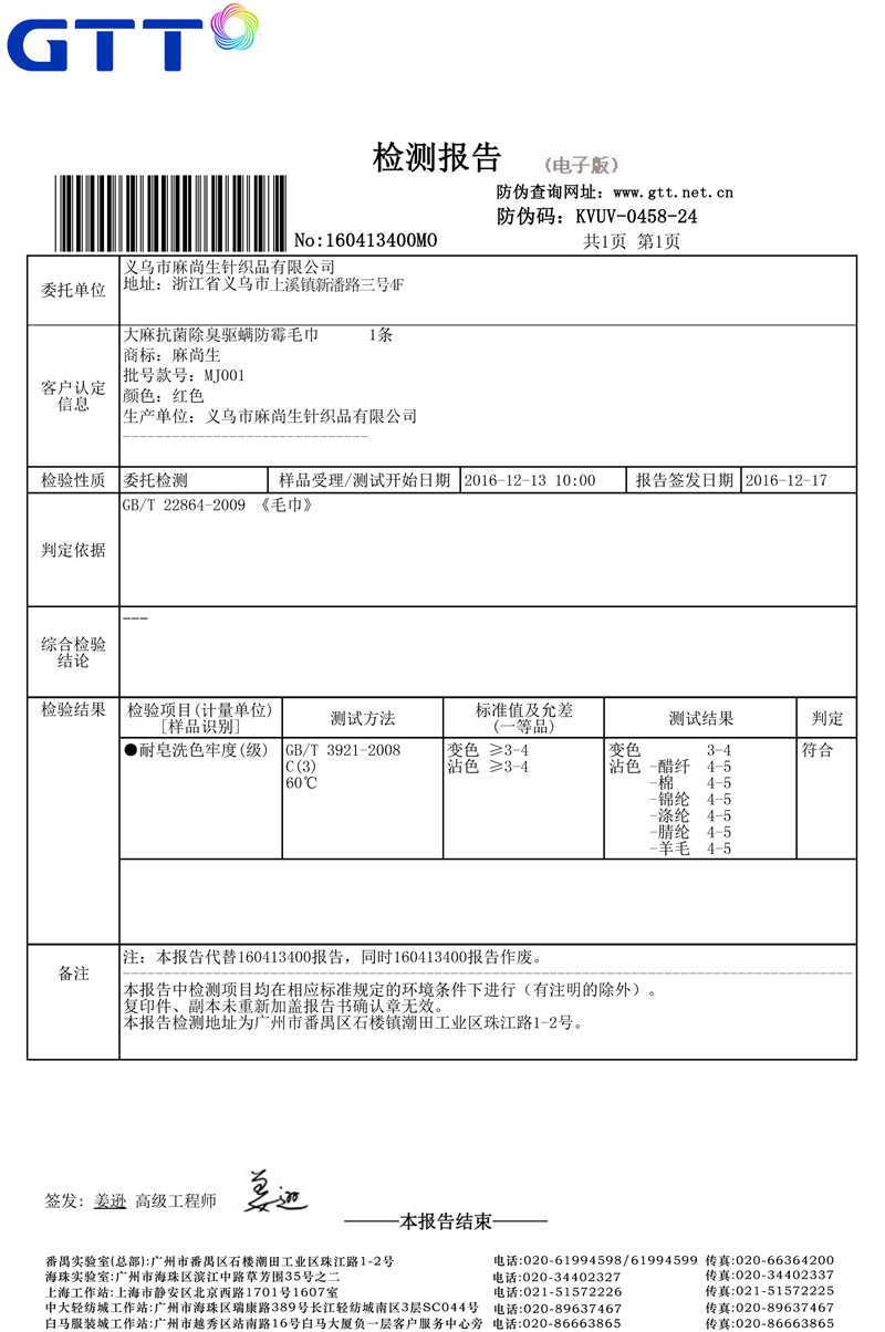毛巾檢測報告